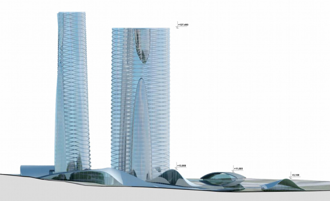 Две башни, вырастающие из бетонных волн стилобата – 36-этажные. Они похожи на песочные часы, внутрь которых налили ртуть, из-за которой возникают зеркальные «перетекания» в центре. Снаружи объемы опутаны кольцами металлической паутины-сетки, придающей им сходство с пружинами. От этого кажется, что они живые и подвижные.