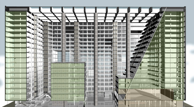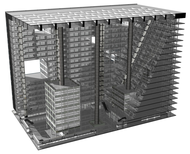 Третья и по-моему главная особенность проекта – этакая латентная (то есть скрытая) классичность. Слоновьи ноги круглых столбов могут напомнить колонны, ячейки потолка – кессоны, ступенчато спускающиеся с южном торце балконы – амфитеатр. Разумеется, все это очень отдаленно напоминает прообразы (если они есть), но это, кстати говоря, лишь обостряет впечатление. Потому что труба для коммуникаций и балки атриума могут быть любого размера, а вот 16-этажная колонна или кессон площадью со среднюю жилую комнату – это подавляет.
