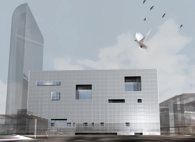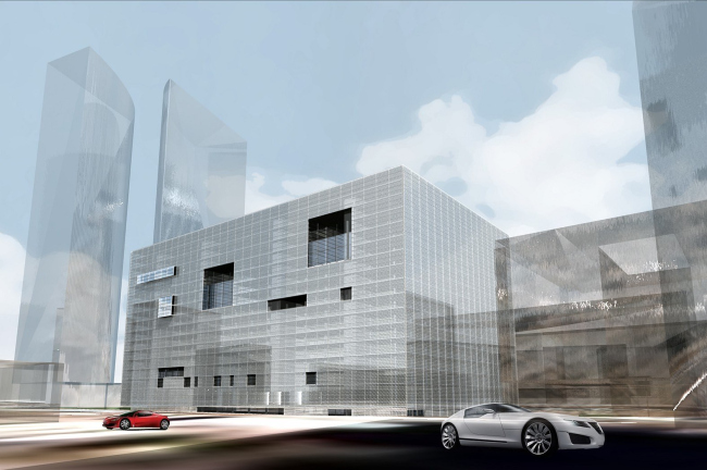 Здание, которое должно было заменить «Президент-сервис» – это простой и крупный параллелепипед с большим внутренним двором. Снаружи он покрыт серебристой металлической сеткой, которую Николай Лызлов, но его собственному признанию, «подсмотрел» на здании посольства Нидерландов в Берлине, построенного Ремом Колхасом. Сетка мелкая и, несмотря на некоторую прозрачность, она делает фасад совершенно закрытым, «завернутым». Что немного похоже на эффект зеленой сетки, которой дома затягивают во время реконструкции – видно, что внутри что-то есть, но не очень понятно, что.