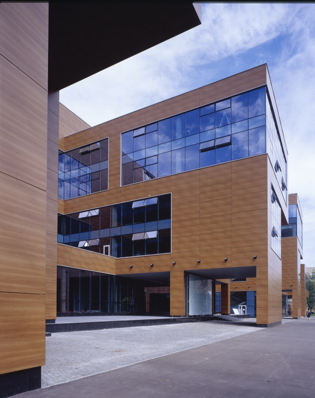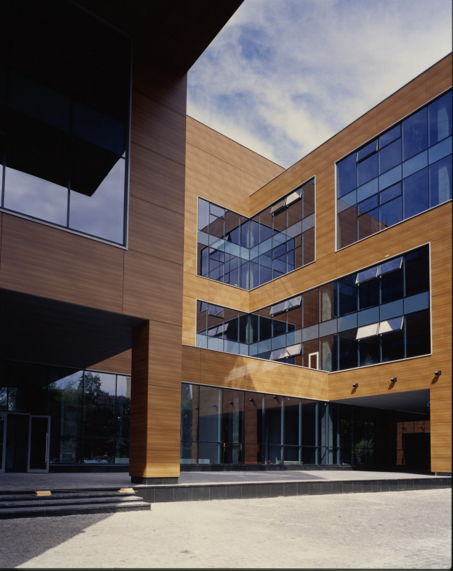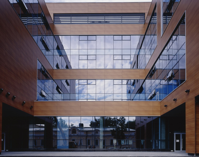 Офисная часть отдана массивной пластике простых форм. Она во многом противоположна дому-соседу: основной тон здесь темный, а не светлый, окна не клетчатые, а ленточные, и масштаб крупнее: окна объединяют по два этажа. Архитектура теряет легкость, присущую жилому зданию, и проникается лаконичной многозначительностью. Но прежде всего, конечно, эта простота и это укрупнение отсылают нас к главному источнику – русскому авангарду. Не знаю, думал ли автор о классиках архитектурного модернизма, но если бы они могли распоряжаться современными материалами – наверное, они могли бы строить что-то подобное.