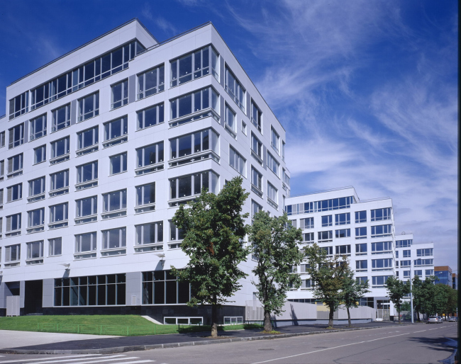 Жилой дом состоит из белой клетчатой материи, оформившейся как тема в гигантском доме-«Аэробусе». Эти клетки со всей очевидностью ведут свое происхождение от модернистских многоэтажек, но существенно трансформируются – цвет светло-серый (на солнце белый), границы тонкие, сетка четкая. Хотя местами сквозь нее прорастают признаки прежнего «фьюжна»: какое-нибудь окно нет-нет да и уменьшится, выпадет из строя, простенок поменяет толщину или цвет на серый, а на месте лестничных клеток прочитываются зигзагообразности. Но таких мест немного, особенно по сравнению с проектом. Все упорядоченно, ясно и четко. Можно даже сказать, что эта белая сетка постепенно становится у Владимира Плоткина видовым признаком жилья, и следовательно она служит помимо прочего и для обозначения функции. Это вполне кристаллизовавшийся и уже узнаваемый образ дома. Композиция же жилых корпусов по сравнению с проектом почти не изменилась – в плане она похожа на двухсторонний гребень, с одним продольным корпусом и тремя поперечными. Последние спускаются ступеньками к парку Трубецких, но это скорее следствие согласовательных процедур, чем архитектурный замысел.