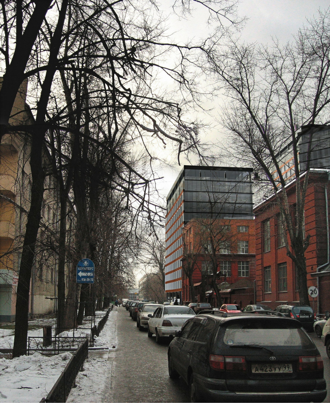 Оба дома обращены к Донскому проезду бело-красными полосатыми фасадами, которые по-конструквистски строго и определенно расчерчены горизонтальными линиями кирпичного цвета, отмечающими уровень пола каждого этажа, кроме верхнего. Поэтажная разметка оживлена диагональным ритмом чередования окон, который отдаленно напоминает шаг гигантской кирпичной кладки – все вместе создает красочный образ современного, но не пренебрегающего контекстом «парадного» фасада, разделенного между двумя домами.