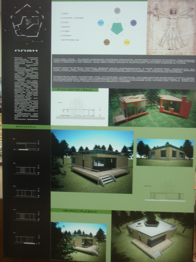 Среди таких концептуальных проектов – Дом Стихий, в основу планировки которого положены земля, вода, воздух, огонь и, что характерно, дух. Каждой из стихий посвящена своя зона в доме, а соединяющим звеном, по замыслу авторов, стало дерево в пятиугольном колодце внутреннего двора. Проект «Дом-А», планировка которого буквально решена в виде буквы «А», выделяется среди других работ необычным скругленным фасадом. По мере понижения рельефа фасад заостряется, тем самым визуально и технически решая проблему перепада высот.