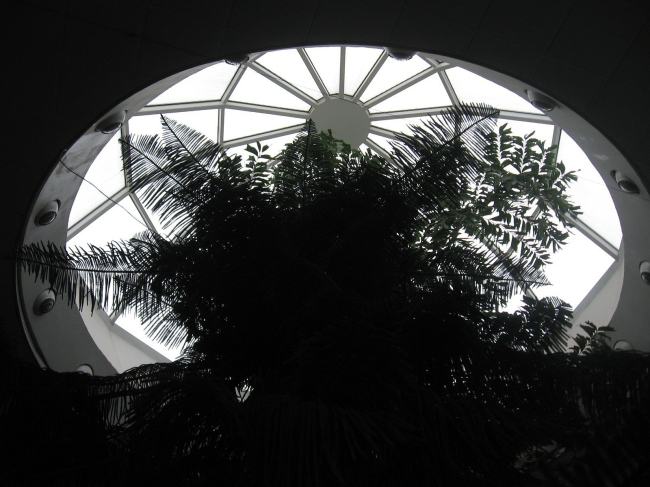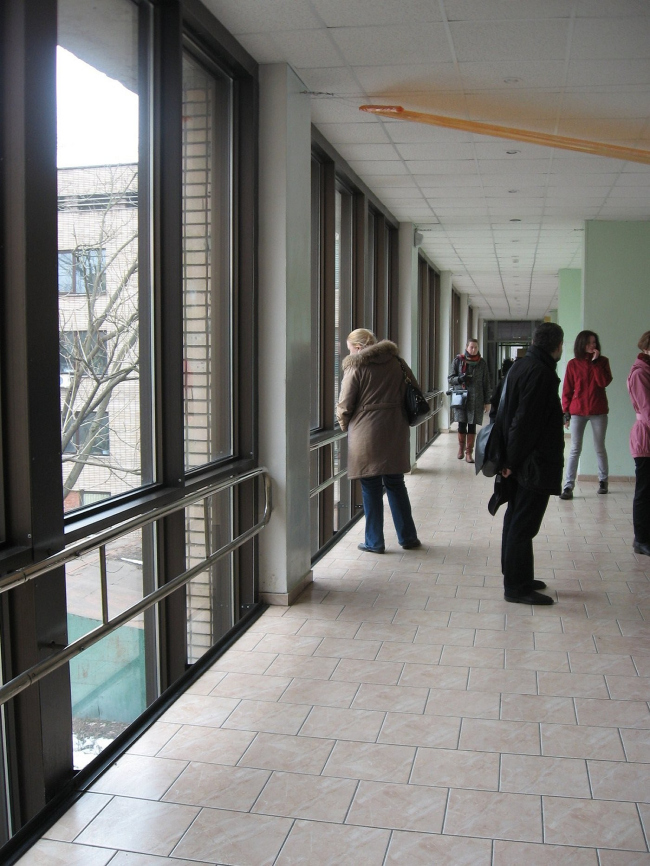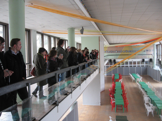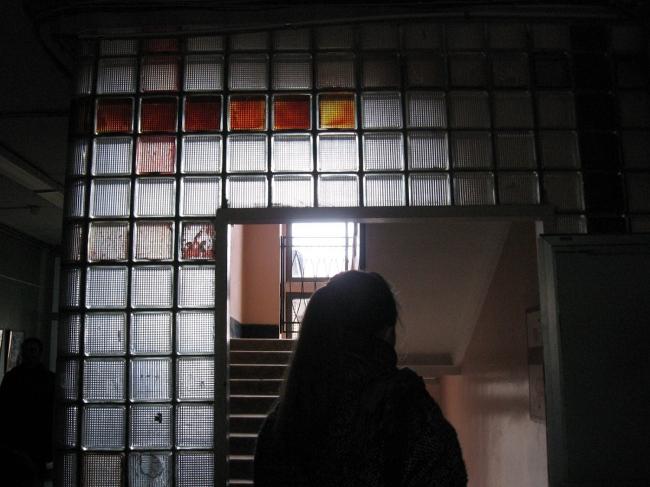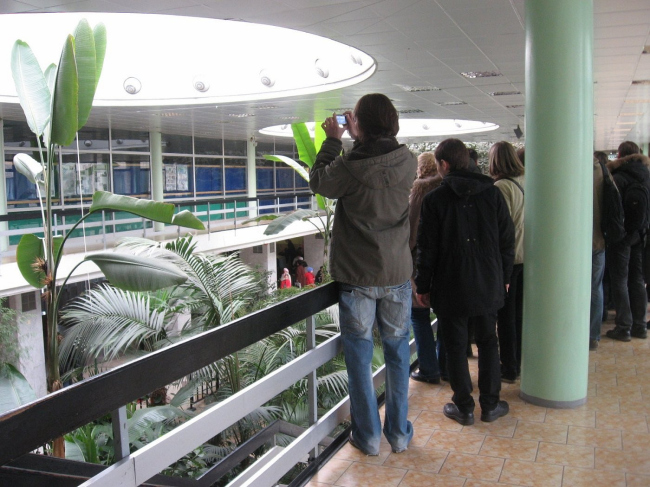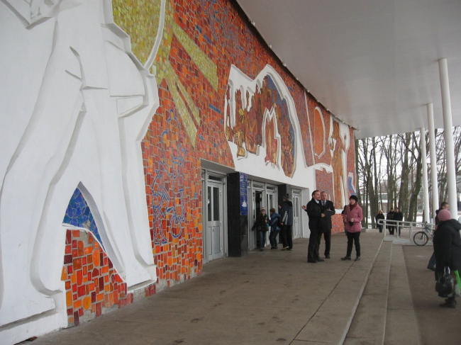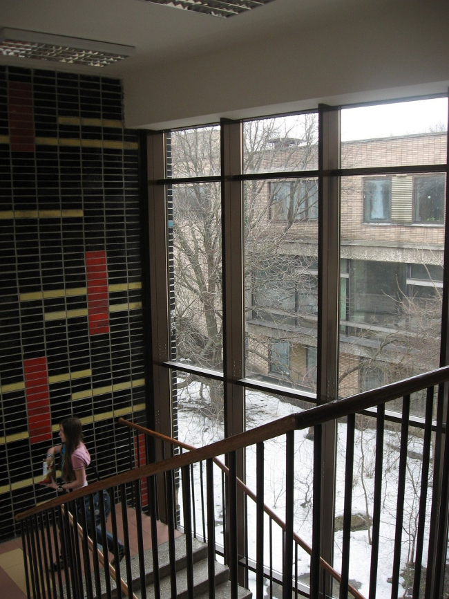 Мы попали внутрь длинного корпуса и прошли его весь насквозь, вспомнив давно забытые ощущения детства – кружки там активно работают и в воскресение, бегают и кричат дети, дворец живет. Причем, живет в тех же интерьерах, что и полвека назад, тут мало что изменилось. Мы миновали цепь светлых и разнообразных пространств, напомнивших задуманные еще Весниными интерьеры Дворца культуры ЗИЛ с их свободными планировками, просторными залами, многоуровневыми помещениями. Аутентичные детали узнаются сразу – это тонкие колонки галерей, керамические вставки на лестничной клетке, особое остекление – все «то самое», из 1960-х.