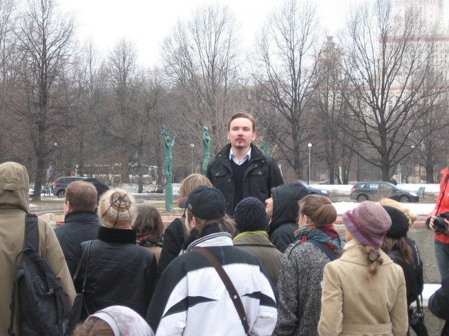 Экскурсантам посчастливилось попасть в интерьеры Дворца пионеров на Воробьевых горах. Об этом удивительном ансамбле многое написано и сказано, и за рубежом он тоже известен. А вот запланированный здесь изначально дворец по проекту И. Жолтовского наверняка мало кому знаком. Архитектор – неоклассик сориентировал громадную парадную композицию из двух крыльев с курдонером на улицу Косыгина, чтобы здание обозревалось с берега Москвы-реки.