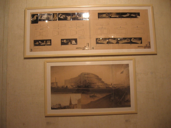 Следуя переменам стиля с середины 1930-х, масштабы клубов начинают увеличиваться, отдельным частям становится тесно в пределах одного комплекса. К этому времени относятся большие стадионы – Измайловский в Москве и стадион им. Кирова в Ленинграде. Тема внутреннего устройства гигантских театральных залов разрабатывалась, главным образом, в ходе знаменательного конкурса на Дворец Советов. Как рассказывает Ирина Чепкунова, основной задачей строителей было получить хорошие проекты больших зрительных залов – за это давали премии. В экспозиции – получивший 2 премию американский проект (с участием болгарских архитекторов), а также нарисованный А. Дейнекой проект, разработанный группой АРУ (архитекторов-урбанистов).
