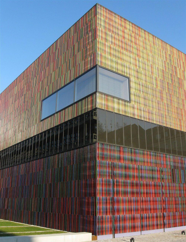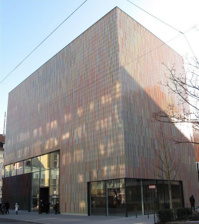 Это второе сооружение в новом «Музейном квартале» — его основу заложила Пинакотека современного искусства Штефана Браунфельса, и этому же архитектору принадлежит генплан всего комплекса. Согласно его замыслу, к длинной стороне прямоугольного блока Пинакотеки должны выстроиться торцами еще четыре музея, каждому из которых достанется узкая полоска земли длиной в ок. 100 м. Особую сложность представляет определение главного фасада любого из этих четырех зданий: из-за неудобной конфигурации участка он может быть только торцевым, но обращенным к городу или к Пинакотеке? Архитекторы повернули Музей Брандхорст (первый из четырех корпусов) лицом к городу, обратив туда его «голову» — блок шире и выше остальной части здания (в плане оно напоминает зеркально отраженную букву Г). Окружающие кварталы сохранили застройку 19 века, а прямо напротив Музея Брандхорст расположен многоквартирный жилой дом Зепа Руфа 1950-х годов. Такое окружение требовало осмотрительности в оформлении фасада, а для «Зауербрух Хаттон» характерны яркие, пестрые постройки. Выходом стало использование очень ярких составляющих (пористых металлических панелей синего и красного цветов, на которых снаружи укреплены разноцветные глазурованные керамические трубки), которые приобретают при взгляде издали почти пастельный колорит: так цвета спектра, сливаясь вместе, образуют белый цвет. Но такой сдержанный вариант был использован только для "головы" постройки: ее основной объем, вытянутый блок шириной 18 м, окрашен более насыщенно: в нижней части, скрывающей галереи второго уровня (первый ярус залов находится под землей), преобладают оттенки красного, верхняя – максимально полихромна. Всего для фасадов постройки были использованы 36 000 стержней 23 разных цветов. Внутреннее пространство, напротив, практически монохромно - белые стены и паркет из светлого дуба; также деревом обшита широкая лестница, связывающая три яруса галерей музея. Чтобы освободить площадь стен для развески работ, было решено почти полностью отказаться от окон. В то же время, даже многие залы подземного яруса получают естественное освещение через систему отражателей, направляющих его в интерьер из снабженных тканевыми фильтрами лент застекления, идущих у стыка стен и перекрытий. Помещения в корпусе-«голове» несколько отличаются от остальных: на уровне земли – это застекленный вестибюль с кафе, в подземном ярусе – самый большой зал музея площадью 460 м2, а на втором этаже – зал с закругленной стеной наподобие диорамы: он предназначен для жемчужины коллекции Брандхорст – 12 полотен серии «Лепанто» Сая Туомбли. При такой развеске зритель сможет охватить их всех одним взглядом. Всего в собрании музея – более 700 произведений современного искусства, в том числе - работы Энди Уорхола, Йозефа Бойса, Дэмиена Херста. Из-за скромного размера музейного здания единовременно удастся экспонировать менее четвертой части коллекции.Музей Брандхорст