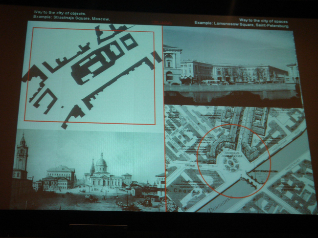 Сергей Чобан выбрал нелинейный способ подачи материала: его рассказ был подчинен концепции с несколькими подтемами, а проекты и построенные здания служили иллюстрациями различных систем взаимодействия городской среды, архитектуры и архитектурной формы. Сергей Чобан начал свой мастер-класс с небольшого теоретического экскурса, где на примере двух хорошо известных нам российских городов – Москвы и Санкт-Петербурга, он показал, насколько разной может быть городская среда. Москва за свою более чем 800-летнюю историю стал городом наслоений и контрастов разных эпох. Ее генокод, по мнению Сергея Чобана – это отдельные объекты-скульптуры. Петербург же напротив – это идеальный город, где форма не имеет значения, а главную роль играет фасад.