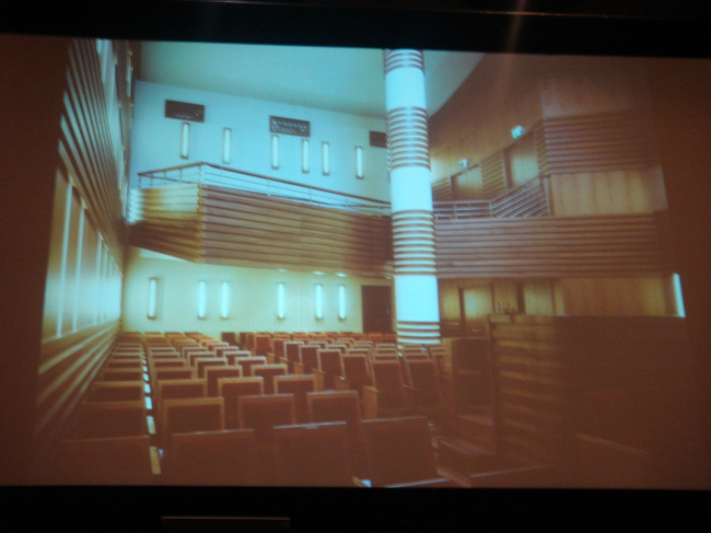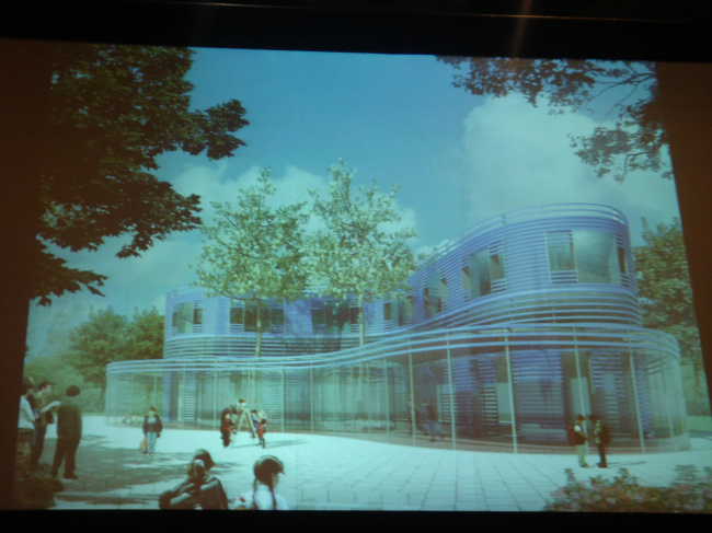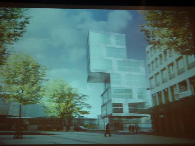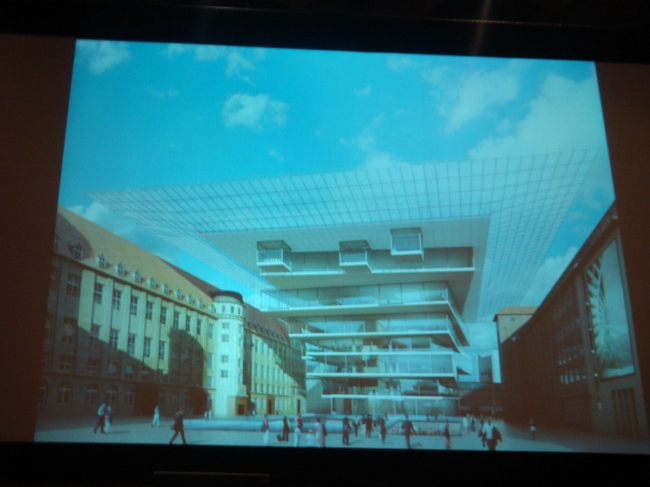 Здание технического музея, место для которого предусмотрено в самом центре Берлина на площади, входящей в комплекс бывшего телеграфа, представляет собой динамичную «скульптуру», противостоящую строгому статичному обрамлению. Здание является опорой для огромной консоли, которая накрывает площадь по периметру, создавая пространство между существующими и новым зданиями, похожее на крытые галереи итальянских палаццо. Внутри музея на лифте можно подняться на крышу и посмотреть с высоты птичьего полета на Берлин. Вторая часть лекции была посвящена проектам, которые продолжают город, воспринимают генетический код города как важную составляющую, на основании которой возникает новое строительство и новая архитектура.