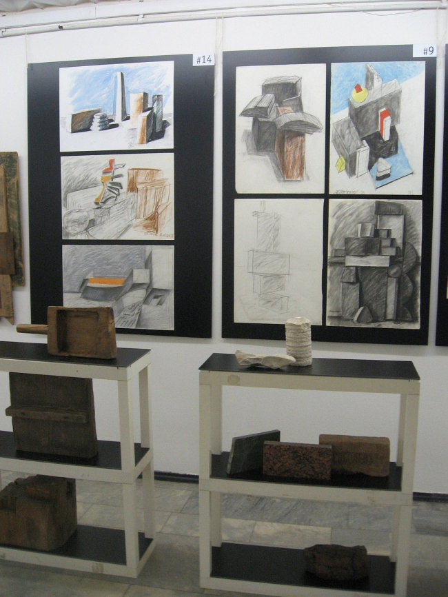 Внимание к «ручным вещам», рисункам и моделям, фактурой и природой, сближает методику Малахова–Репиной с Александром Ермолаевым. «Но его пропедевтика, – говорит Евгения Репина, – абсолютно мастерская, мы снимаем шляпу. Мы, может быть, не добиваемся такого качества, у нас преобладает игровой аспект…» Александр Ермолаев руководит своей школой уже тридцать лет. Она родилась из неформального кружка МАрхИ под названием «Театр архитектурной формы» – ТАФ, в 1980 году. У Ермолаева нет жесткой программы, он каждый раз импровизирует вокруг какой-то актуальной темы, воспитывая и в своих студентах нетривиальность, новизну, открытый подход к решению любой задачи. Студенты всегда начинают с того, что учатся видеть структуру окружающего мира с примитивных пятен, линий, простейших предметов, чтобы потом различать внутреннее устройство, геометрию, форму в архитектуре. Эти штудии и представлены главным образом на стенде мастерской. Из архитектурных проектов здесь только один – детская площадка. Связанная, однако, с глубокими размышлениями о сторонах света.
