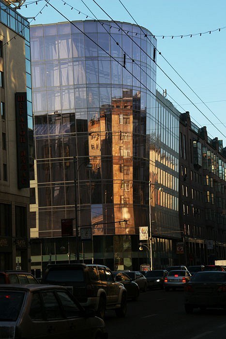 Любопытно также рассмотреть два других здания лидирующей четверки, особенно если учесть, что в процессе голосования они претендовали и на первое место. «Интеллект-телеком» – это реконструкция здания АТС. Сейчас о такой реконструкции много говорят, проектов много, готовых зданий мало. Надо признать, результат получился неплохим, во всяком случае очень заметным. Два больших здания на Большой Грузинской, с некоторых пор фланкирующие 1 Брестскую улицу – продукт в большей степени сомнительный, в основном из-за марганцево-розовой окраски стекол. Дома строились довольно-таки долго и долго стояли в бетоне. На мой взгляд бетонными они были лучше – была в них какая-то правда формы: круглые опоры, плоские перекрытия. Когда на них натянули плоские розовые фасады, стало жалко.
