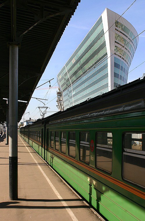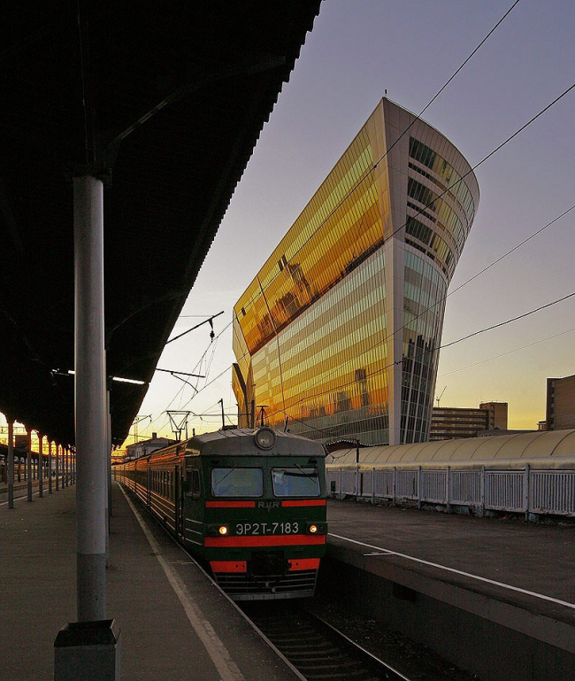 Но они боролись, хотя и неявно (так как зрители – посетители сайта премии, были лишены удовольствия наблюдать эту борьбу), и результатом стала победа «Китежа». «Я с самого начала думала, что это здание получит большинство голосов – говорит Эрика Маркарова, директор премии «Дом года», наверное, из-за его необычной формы…». Форма действительно необычная, прежде всего потому, что перевернутая. Внизу меньше, вверху больше. С торца, со стороны здания вокзала похоже… правильно, на гвоздь, или на кнопку, воткнутую в землю не до конца. Хотя поизящнее будет сравнение с кораблем – впрочем, среди зданий XX века приблизительно треть (если не больше) напрашиваются на сходство с лайнером. Здесь оно, во всяком случае, не буквальное. Грязную и муторную вокзальную площадь оно определенно украсило, из поезда – смотрится замечательно, все такое гладкое и стеклянное.