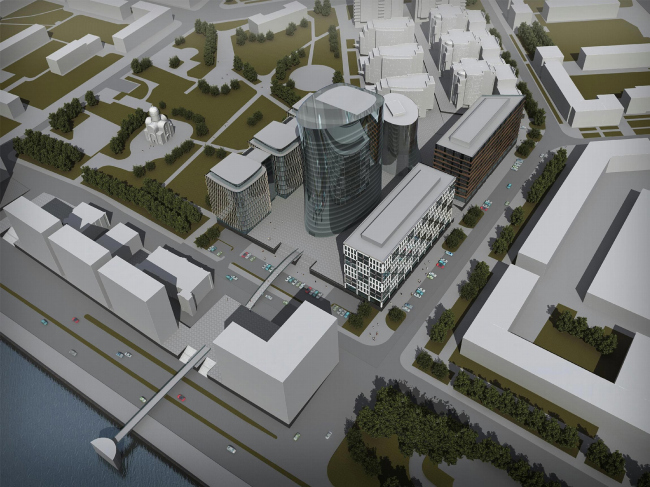| Географические названия редко становятся синонимом громкого скандала, но Малая Охта – безусловно, исключение. Именно в этом районе должен быть возведен кукурузоподобный небоскреб компании «Газпром», и лишь финансовый кризис оказался в силах остановить скандальное строительство на неопределенный срок. Комплекс общественно-деловых зданий «Малая Охта» – ответ архитекторов Евгения Герасимова и Сергея Чобана на вопрос о том, уместна ли современная высотная архитектура в контексте исторического города. Да, уместна. Но билет в жизнь ей способен обеспечить лишь разумный компромисс. Ядро комплекса, расположенное в глубине квартала – стеклянная башня, окруженная корпусами с разными фасадами. «Евгений Герасимов и партнеры»Территория комплекса, ограниченная с запада Свердловской набережной,  с востока – Малоохтинским проспектом, с севера – Республиканской улицей, а с юга – Перевозным переулком, на самом деле состоит из нескольких прилегающих друг к другу участков, каждым из которых управляет отдельный девелопер. Девелоперы договорились действовать в интересах города и разработать единую градостроительную концепцию развития нового делового района – случай достаточно редкий. Однако интересы города здесь счастливым образом совпадают с коммерческими – качественная, стилистически выдержанная среда обитания, предназначенная для бизнеса, способна принести гораздо большие дивиденды, чем разрозненная офисная застройка. Для реализации замысла была приглашены Евгений Герасимов и Сергей Чобан, известные своими партнерскими проектами в Санкт-Петербурге. Затем для проектирования отдельных зданий пригласили ряд известных западных архитекторов.  Доминантой комплекса является высотное здание банка «Санкт-Петербург», однако его габариты, в отличие от вышеупомянутого скандального проекта (который, кстати говоря, приходится новому кварталу ближайшим соседом), соразмерны существующей застройке, а его «рост» (90 м, 21 этаж) не нарушает высотный регламент. Внешне башня представляет собой полностью остекленный цилиндр с косо срезанной верхушкой. В плане это неправильный овал, острым носом обращенный к Неве, а более округлой «спиной» – к городу.  Выбор в пользу стекла как основного материала для фасадов объясняется не только желанием заказчика получить ультрасовременное здание, но и заботой о канонических панорамах города. Стеклянный объем, не имеющий острых углов и ломаных граней, не прорезает питерское небо агрессивным шпилем, но словно бы сливается с ним, вбирает в себя как губка окружающие пространства и виды. Интересно и то, что стеклянная башня отнесена вглубь набережной – она будет читаться издалека и с воды, но для гуляющих вдоль Невы пешеходов город в целом сохранит прежний, привычный масштаб. Впрочем, по главной оси комплекса, ведущей от набережной к зданию банка, фронт застройки вдоль реки разрывается: на воде формируются причал, смотровая площадка и ресторан, а к призрачному из-за своего эфемерного одеяния небоскребу перекинут пешеходный мост, который свяжет набережную со стилобатной частью высотки, минуя дублер Малоохтинского проспекта. Ближайшее окружение башни составляют несколько офисных зданий, чья высота не превышает привычной для этого района отметки в 42 метра. Они фланкируют башню, выстраиваясь в две л