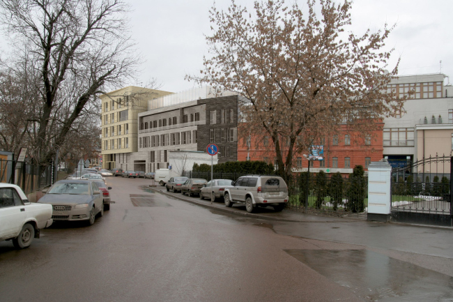 Впрочем, модернизм на красной линии исторической Остоженки отнюдь не будет смотреться «внеисторическим» чужаком. По словам главного архитектора проекта Алексея Медведева, авторы стремились к «современной, но глубоко контекстуальной архитектуре». Новое здание полностью сохраняет исконный масштаб улицы. Фактически это цельный объем, но снаружи он разделен на разные части и выглядит так, как будто бы состоит из трех разных домов – имитируя таким образом историческую парцелляцию бывших на этом месте участков. Вереница фасадов элегантно изгибается вдоль Остоженки, что в точности воспроизводит старую линию застройки.