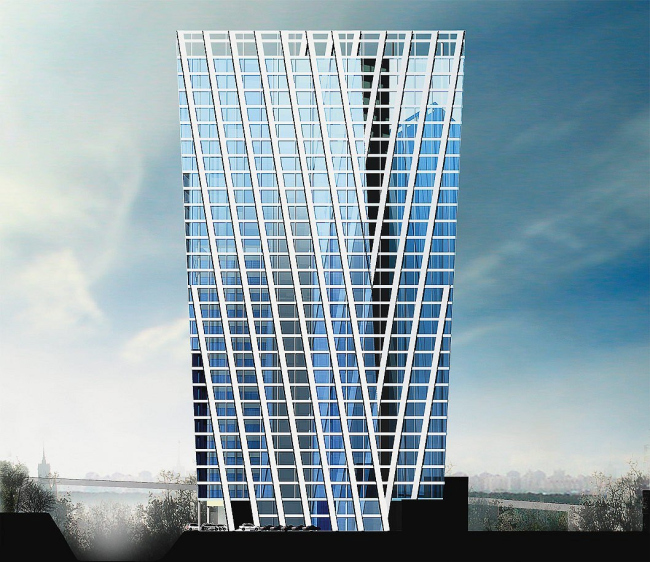 Надо сказать, со времени фантастической башни Татлина архитекторы нечасто балуют Москву наклоненными, как Пизанская башня, зданиями - «танцующие дома» пока что были не для нас. Владимир Плоткин корректирует эту ситуацию аккуратно, но настойчиво. Легкий наклон каждой башни зрительно усилен с помощью графического приема, знакомого большинству людей по сборникам шарад и загадок: по фасадам проведены вертикали с еще большим углом наклона, многократно усиливающие эффект. То, что наклонные линии «лицевых» фасадов параллельны друг другу, слегка завораживает глаз, заставляя на время поверить в несуществующее движение, и прямо указывает на источник приема – оп-арт, или искусство, основанное на зрительной иллюзии.