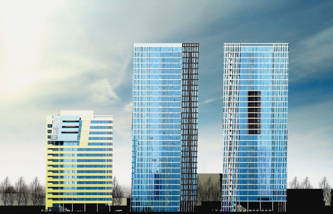 Вдоль Бумажного проезда, чинно покачиваясь, вышагивает семейство небоскребов – первый немного склонился вправо, второй – влево, третий – пониже и поплотнее, зато с игривой «шапочкой набекрень», вторит наклону первого. Три башни, проектируемые Владимиром Плоткиным, недвусмысленно напоминают жанровую сценку в исполнении художника-кубиста самых строгих правил: все очень абстрактно и в то же время для человека XXI века понятно, у первой башни даже намечен обведенный красной рамкой «рот» - может быть, прогуливаясь наши герои ведут между собой спокойную беседу. Дома поставлены на тонкие «ножки» галерей, что еще больше усиливает знаковое сходство с прогулкой.
