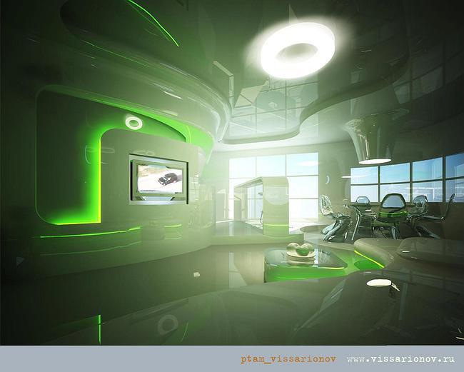 Всего в доме разместятся два апартамента: на первом этаже холл, две спальни и гостиная с собственным выходом во внутренний дворик, на втором – холл, спальня, гостиная и просторная двухуровневая терраса с обзорной площадкой на плоской кровле. В цоколе размещен винный погреб. В оформлении интерьеров гостевого дома архитекторы также верны биоморфизму, однако в границах отдельно взятых помещений он приобретает куда более радикальные, откровенно футуристические черты. Так, стены комнат выполнены из полимербетона и оформлены цветной подсветкой. Из пола и стен то тут, то там неожиданно «вырастают», словно выплавляются прямо на наших глазах необходимые предметы мебели. Светильники решены в виде сталактитов, свисающих с потолка, полки и стеллажи трактованы как кратерообразные ниши, утопленные в стены. Ощущение пребывания на космической станции усиливают окна-иллюминаторы и такая же скругленная форма дверных проемов, больше напоминающих перегородки между отсеками в звездолетах.