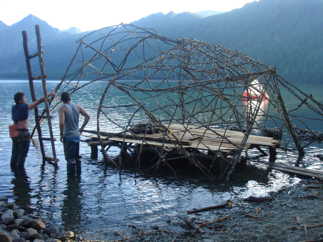 В общем, тяжелая дорожная ситуация, постоянно меняющаяся погода и «перебои» со стройматериалами заставили архитекторов в прямом смысле выживать в сложных условиях горного Алтая. Выживало в этой среде и творчество. Строительство велось и в солнечную погоду, и под проливным дождем, в холодной воде и высоко на деревьях. С упорством первобытного человека архитекторы шаг за шагом возводили эко-дома, плоты, пристани и переправы. Кто-то отказался от своих «домашних заготовок» и разрабатывал новый проект на месте, а кто-то, наоборот, упорно реализовывал то, что задумал. Многие объекты, которые изначально предполагалось построить на земле, в итоге были спущены на воду. По словам архитекторов, которые были на «Зурбагане», прошлогоднем летнем фестивале в Крыму, даже там не было столько объектов на воде, хотя море было намного теплее горного алтайского озера.