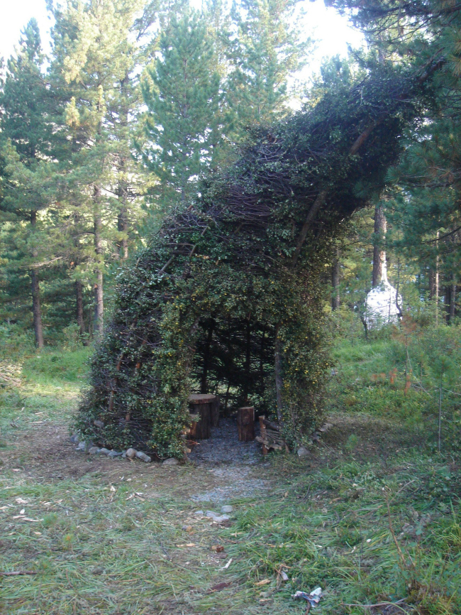 Неподалеку от лавочки также в воде расположился объект «Шалаш», который представлял собой настил на сваях, укрытый полукруглым навесом, сплетенным из кривых веток. Еще один объект – «Храм ветра» – расположился в лесу. По форме он напоминал шалаш в виде конуса с сильно вытянутой и загнутой вбок острой верхушкой. Как будто сильный порыв ветра накренил его шпиль, и в таком положении «храм» застыл. «Храм ветра» был построен в «Зеленом городе» не случайно: архитекторы хотели задобрить духов погоды.