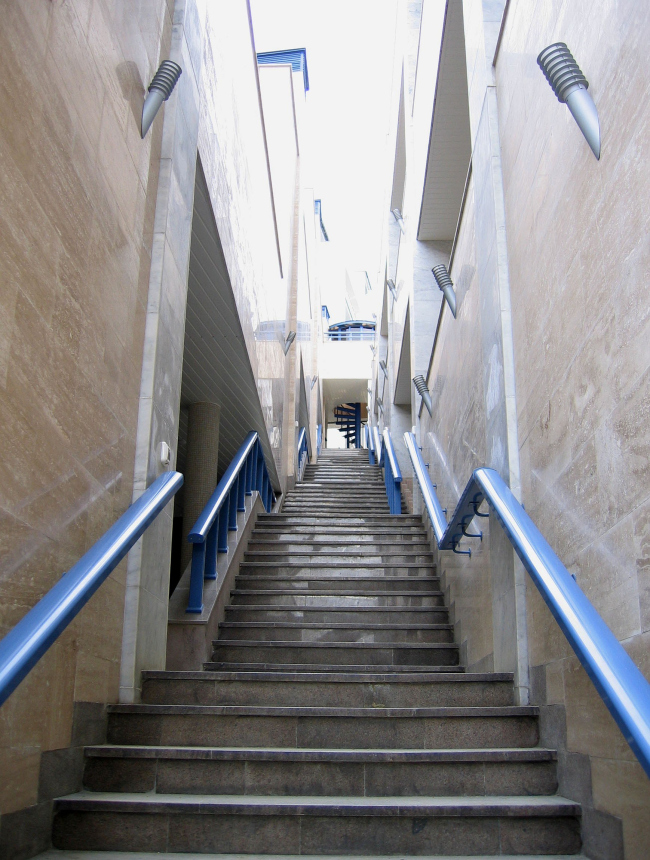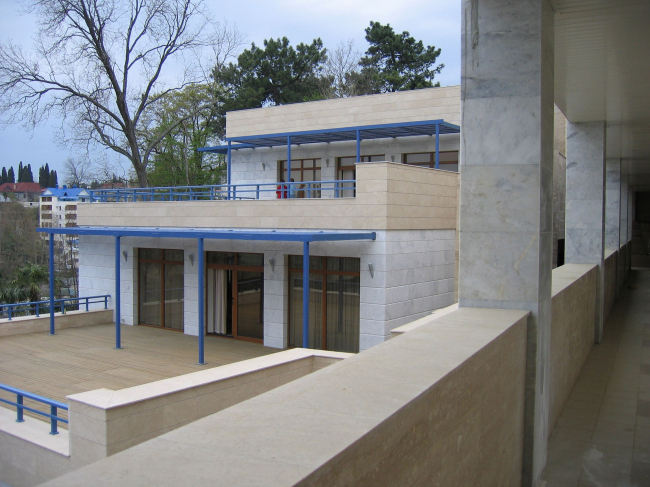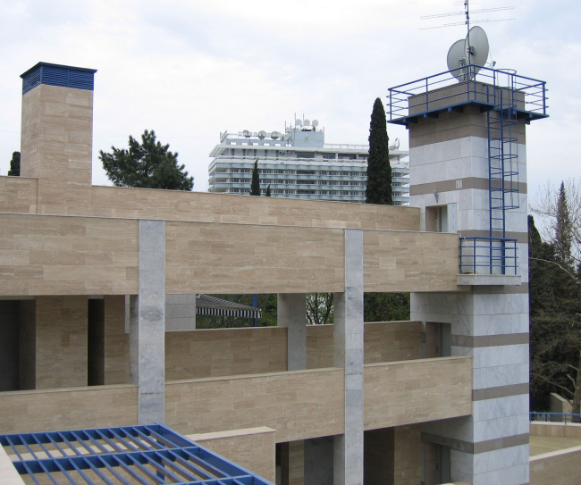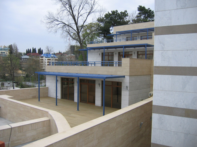 Многочисленные любители отдыха на море сегодня все чаще приходят к мысли о том, что вместо ежегодных поисков подходящей гостиницы или съемной квартиры, проще и выгоднее обзавестись на побережье собственным жильем. Обычно, правда, в этом случае ограничиваются покупкой квартиры – благо таких предложений в Сочи множество. Но когда потенциальными покупателям оказываются друзья и коллеги, сама собой напрашивается мысль объединить усилия и построить отдельный жилой комплекс «только для своих». Так Владимир Биндеман, руководитель мастерской «Архитектуриум», получил заказ на проектирование 6 апартаментов площадью по 200 квадратных метров каждый. Участок, приобретенный заказчиком для строительства комплекса, расположен в центре Сочи, неподалеку от одного из самых известных санаториев города – «Светланы». Отсюда рукой подать и до моря, и до знаменитого сочинского цирка, а также до «Зимнего театра», главной морской набережной курорта и Дендрария. С юго-восточной стороны участок ограничен шумной Черноморской улицей, а своей северо-западной границей примыкает к памятнику архитектуры «Дача доктора А.В. Якобсона» 1902 года постройки (ныне – один из корпусов «Светланы»). Он расположен на довольно крутом склоне и долгое время считался частью парковой зоны. Требований к будущим апартаментам у заказчиков было немного: ориентация гостиных на море, наличие 2-3 спален в каждой квартире и наличие на первом этаже общественной зоны, объединяющей бассейн, спортзал, массажные кабинеты и гостиную с бильярдом. Основную архитектурно-планировочную идею комплекса проектировщикам подсказал сам рельеф: «компенсировать» перепад высот в 17 метров можно, только создав несколько уровней террас. По словам Владимира Биндемана, практически сразу было решено сделать «дом-лестницу» - и издалека комплекс действительно напоминает несколько гигантских ступенек, по которым какой-нибудь Гулливер мог бы взбежать от моря к бетонному коробу «Светланы». Правда, сложная форма рельефа не позволила архитекторам ограничиться банальным размещением террас одна под другой – два крыла комплекса по мере спуска к морю словно слегка разъезжаются в разные стороны, «обходя» неудобный хребет. Связующим элементом между ними и главной осью всей композиции служит лестница, берущая торжественный парадный разбег снизу и постепенно сужающаяся кверху. Сначала архитекторы собирались накрыть лестницу светопрозрачной конструкцией, но затем посчитали, что открытые марши еще больше подчеркнут южный характер постройки, и на случай дождя ограничились размещением на каждой площадке водоприемных решеток. Наибольшую сложность при разработке проекта вызвали фундамент и конструктивная схема здания. Дело в том, что участок, на котором построен пансион, с одной стороны, обладает сейсмичностью 8,5 баллов (для сравнения: на площадках, сейсмичность которых равна 9 баллам, СНиПы зачастую уже вообще не позволяют что-либо строить), а с другой, может «похвастаться» оползневыми грунтами. Ни то, ни другое для Сочи не редкость, но парадокс заключается в том, что нормы строительства в каждом из этих случаев противоречат друг другу. Сейсмика диктует членить здание на независимые блоки, а угроза оползней, наоборот, предписывает возводить монолитный объем, и увязать эти требования между собой практич