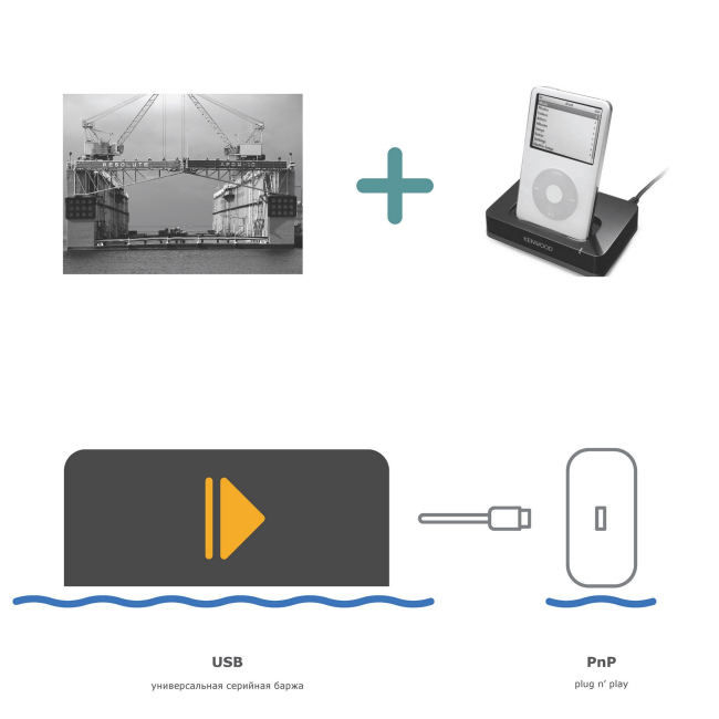 Придуманная архитекторами система стандартного подключения «баржи» к пристани напомнила им стыковочный узел космического корабля или компьютерный порт; отсюда возникло название USB, так как известно, что сейчас самый удобный и простой в использовании порт – это usb. Хотя и космический корабль упомянут неслучайно: по части универсальности «баржа» как раз находится, условно говоря, где-то между сложнейшим (космическим кораблем) и простейшим (компьютерным портом). И как следствие по сложности приближается к автобусу.