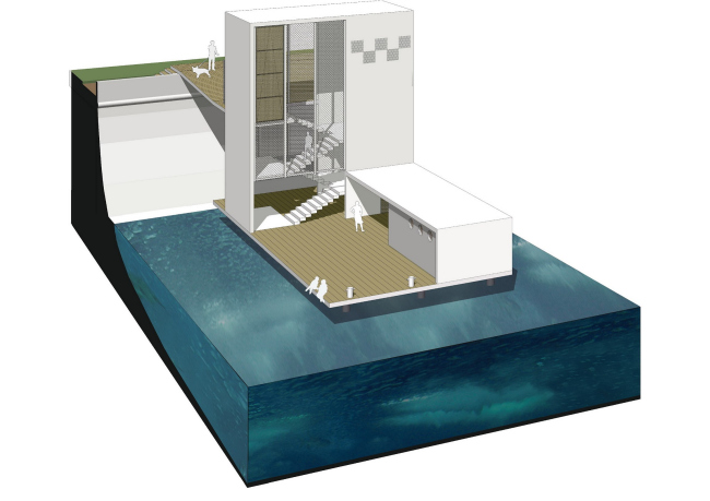 Снаружи параллелепипеды универсальных модулей USB-«баржи» предполагается затягивать отступающей от стен прозрачной металлической сеткой. Ее холодноватый блеск и полупрозрачность сродни водной поверхности; эта фактура призвана визуально облегчить объемы. На сетку наносятся крупные значки, сообщающие прохожим о функции того или иного модуля. Днем все это должно выглядеть сдержанно, зато ночью коробки USB задумано подсвечивать и превращать в медийные экраны, освещая город и украшая реку.
