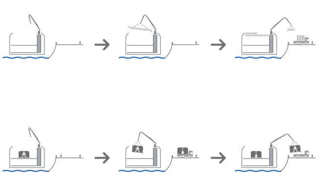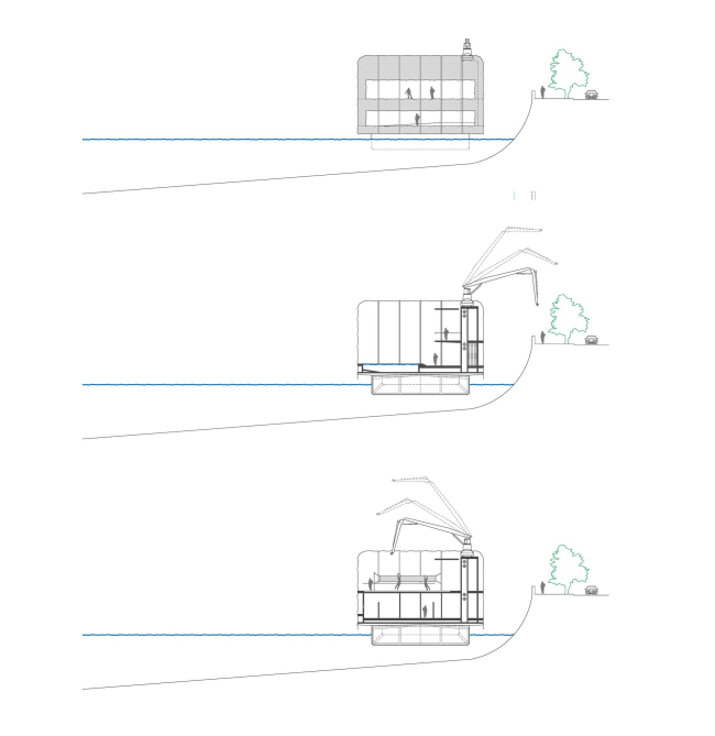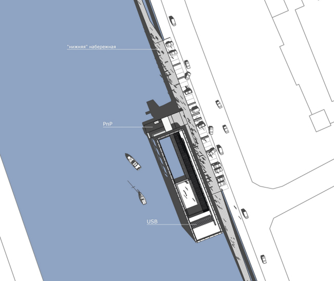 Итак, архитекторы мастерской Сергея Киселева назвали свой проект USB. В этом названии заключается, если можно так сказать, половина специфики предложенного решения – та половина, которая отвечает за обобщение. Авторы расшифровывают это название: «универсальная серийная баржа» и подчеркивают, что главная ее особенность – в стандартизированном подключении. А именно, на набережных предлагается соорудить специальные причалы, оснащенные инфраструктурой (тепло, электричество, вода, канализация, связь). К таким причалам будет удобно стыковать типовое же сооружение, стоящее на плавучей основе баржи. Так же легко отстыковать, поменять, поставить две вместо одной (каждый причал имеет два «порта» для соединения). Само сооружение-«баржа» также имеет собственный причал – для маленьких кораблей, яхт или внутреннего речного транспорта. Таким образом оно, стыкуясь к стандартной пристани, создает собственную пристань, поменьше.