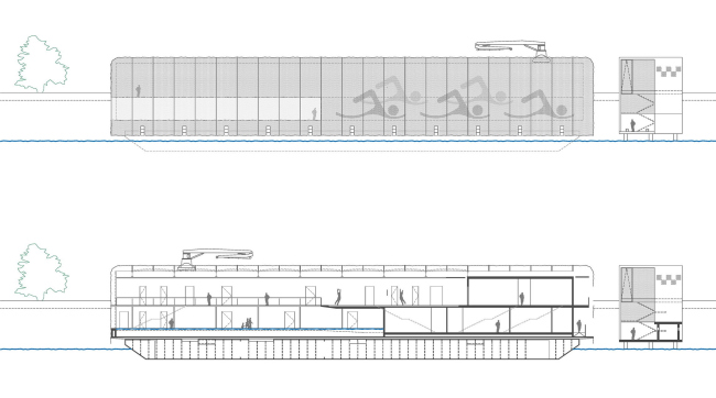 Как многие помнят, конкурс был организован Ц:СА для Национальный ассоциации судостроителей. Поэтому у него было две объявленные задачи – одна узкая и понятная, а именно спроектировать некоторое сооружение, которое могло бы существовать на реке. Вторая очень расплывчатая и широкая – привлечь к Москве-реке внимание общественности и заставить всех задуматься о градостроительных проблемах существования реки в большом городе (для этого проводились специальные круглые столы и презентации). Необходимость совместить частное с общим, плавучее сооружение 62х12 метров – с градостроительными размышлениями, во многом определило специфику проектов, в том числе и проекта СКиП.
