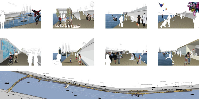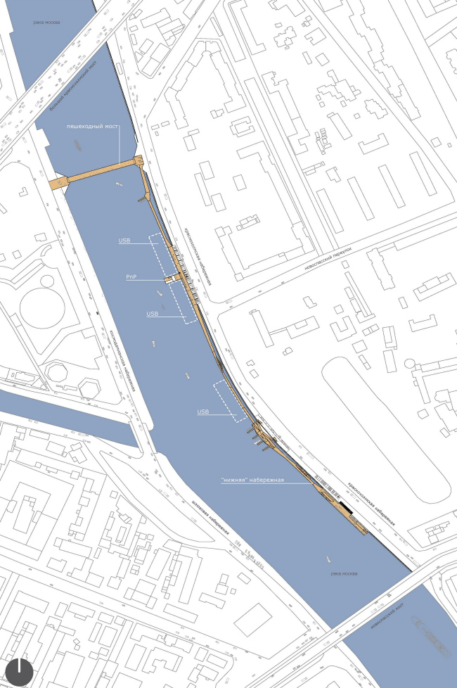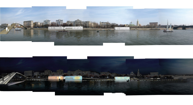 Средством для такой «привязки» стала деревянная пешеходная набережная, которую авторы проложили ниже существующей каменной. Нитка деревянного помоста связала вместе три модульных «баржи», существующую неподалеку от Новоспасского пруда пристань и упомянутый мост, который в проекте СКиП существует в том же легком исполнении, что и пешеходная набережная.