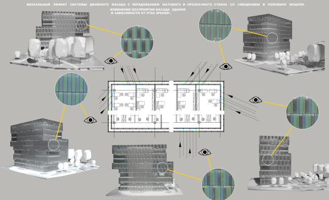 Саид Джабраилов, главный архитектор проекта: «Одна из интересных особенностей этого проекта – специально разработанная для него система двойного остекления фасада, позволяющая использовать его как регулируемый. В зимнее время межфасадное пространство аккумулирует тепло и помогает обогревать здание, а в летнее, наоборот, активно вентилируется, отводя избыток тепла от внешней стенки здания и помогая за счет этого существенно экономить энергию на кондиционирование помещений. Двуслойный стеклянный фасад играет ключевую роль и в создании архитектурного облика здания. Как уже говорилось, мы используем прозрачное и матовое стекло, причем в последнем случае двух разных оттенков: внешний слой делаем светло-зеленым, а внутренний - голубоватым, и за счет наложения их друг на друга получаем очень интересный по колористике фасад. При этом мы понимали, что сложность разработанной нами конструкции останется невыявленной, если фасады полностью сделать такими. Поэтому и появились прозрачные, однослойные вставки – они выгодно подчеркивают глубину и многомерность основного «одеяния» здания.» Саид Джабраилов, главный архитектор проекта