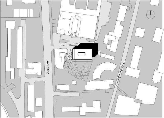 К недостаткам участка относятся не только его скромная площадь и плотная застройка границ, но и ограниченность подъезда к нему. С улицы Гиляровского к будущему комплексу можно лишь подойти пешком, и то не без сложностей, а с улицы Щепкина в принципе можно подъехать на машине, но вот развернуться или разминуться со встречной машиной уже негде. Между тем перед архитекторами, конечно, стояла задача соблюсти все противопожарные нормы и, в частности, обеспечить пожарный подъезд к зданию. Дорогу предсказуемо «протянули» с улицы Щепкина, а вот для организации разворотной площадки и въезда в подземную парковку пришлось пожертвовать частью объема первого этажа.