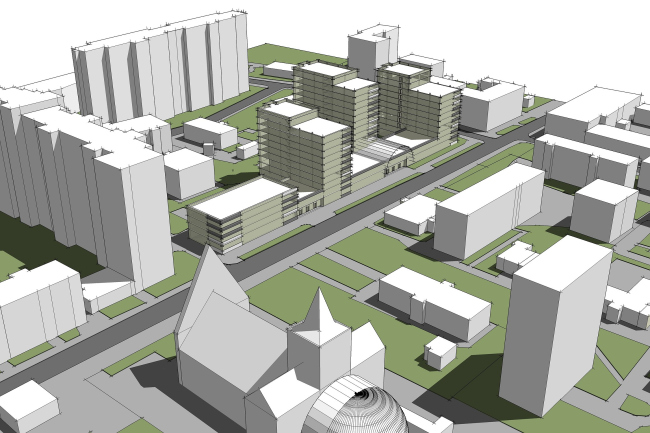 Существующее общежитие Московской государственной консерватории еще недавно можно было использовать как декорации для съемок фильма ужасов. Крошечные 12-метровые комнаты, в которых живет по 2-3 студента, душные репетитории в подвалах, душевые с вечно забитыми водостоками и пышная плесень на стенах… В последние пару лет руководство прославленного ВУЗа все же нашло средства на частичный ремонт общежития, и самые вопиющие проблемы были устранены, однако от острой нехватки квадратных метров для проживания и репетиций это не избавило. И когда мастерской был заказан проект реконструкции общежития, архитекторы практически сразу предложили не надстраивать существующие пятиэтажные корпуса, а разобрать их, не пытаться худо-бедно перекроить существующую планировку – скупое наследство 1960-х, -- а построить для студентов новое жилье, соответствующее всем современным нормам.