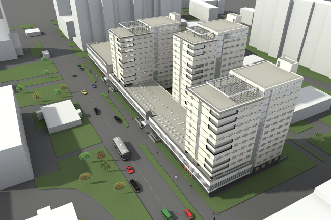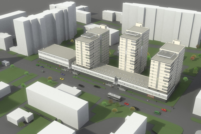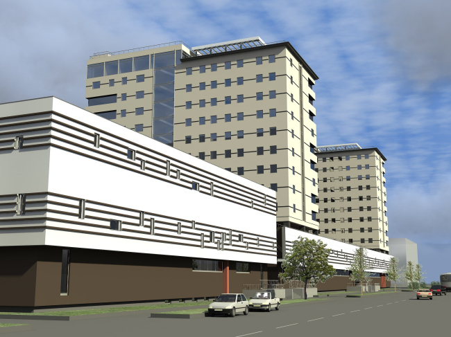 Всего в состав комплекса обновленного общежития войдет пять объемов – три уже упомянутых жилых (центральный корпус будет иметь 14-15 этажей, два фланкирующих его - по 12-13 этажей) и два малоэтажных, предназначенных для размещения нужных студентам нежилых помещений. Трехэтажный блок с актовым и киноконцертным залами смещен левее высотной композиции, а вытянутое двухэтажное здание с входными вестибюлями, бюро пропусков, кафе и столовой, а также спортзалом и бассейном служит опорой для двух крайних башен. Примечательно, что все репетитории, расположенные здесь, имеют верхний свет – плоская кровля стилобата буквально «простегана» линзами световых фонарей.