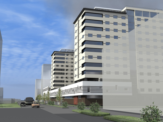 Предложенный план, безусловно, заманчив и благороден, но и самому архитектору, и тем более руководству МГК была очевидна и его обратная сторона: фазы «снос старых корпусов» и «сдача в эксплуатацию новых» неизбежно будут разделены довольно большим отрезком времени, в течение которого будущим музыкантам тоже нужно где-то жить… Так возникла идея трехчастной композиции обновленного общежития: сначала возводится один новый корпус и в него переселяются обитатели одного из существующих корпусов, затем первая пятиэтажка сносится и на ее месте возводится второй новый объем, в который въезжают уже жители второй пятиэтажки, после чего и она благополучно ликвидируется, уступая место новому зданию.
