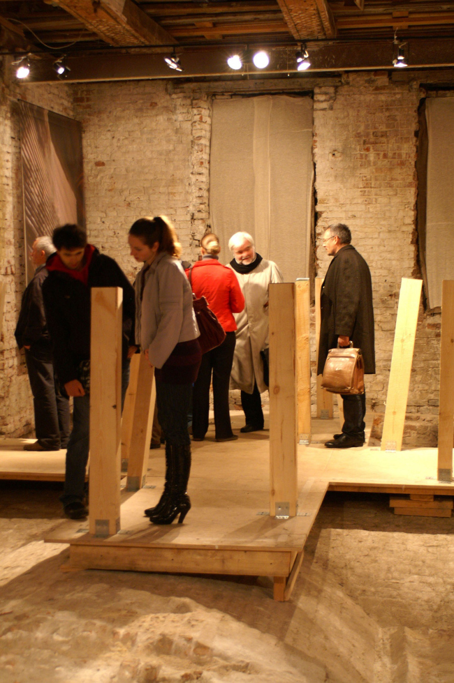 Разместилась же экспозиция во флигеле-руине, чья ограниченная площадь, казалось бы, для показа 120 объектов ну никак не предназначена. Но Савинкин и Кузьмин нашли очень простой и стопроцентно соответствующий тематике выставки способ, предложив использовать в качестве основных «витрин» не стены, а клееный брус – кстати, самый прочный и надежный стройматериал из числа деревянных. Фанерные мостки ощетинились двухметровыми «иголками», установленными зачастую под самым замысловатым углом, а на их завершениях и размещены фотографии объектов, которые кое-где перемежаются высказываниями российских архитекторов о работе с деревом. Из цитат этих, в частности, можно узнать, что Тотан Кузембаев работает с деревом, потому что это единственный «мирный» материал, из которого никогда не делали оружие, Александр Скокан мечтает построить деревянное здание уже не один десяток лет, а Сергей Ткаченко очень боится пожаров. Стены при этом тоже не остались голыми – где-то висят гигантские постеры самых знаменитых наших деревянных построек типа Яхт-клуба Кузембаева, а куда-то проецируются «живые картинки», рассказывающие об эволюции жанра за последние сто лет.