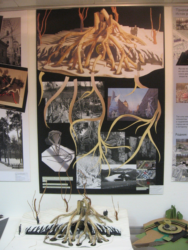 Ту часть экспозиционного пространства, которая в этом году по причине кризиса оказалась не занята частными проектами, использовали для экспонирования своих дипломных работ студенты «Кафедры ландшафтной архитектуры» МАрхИ и факультета почвоведения МГУ. Здесь же разместились арт-объекты, выполненные в рамках новой конкурсной номинации «Древо жизни». Среди прочих особенно выделялись своими масштабами два «древа» – деревянный идол якутских дизайнеров и огромных размеров персонаж, придуманный архитектором Кириллом Баиром. Две известные студии – детская школа искусств «Старт» и мастерская «ТАФ» также не остались в стороне от экспериментов с «древом»: первые нарядили в платья-клумбы манекенов, а вторые смастерили древо «культуры и традиции», из которого вырастают «ростки креативности».