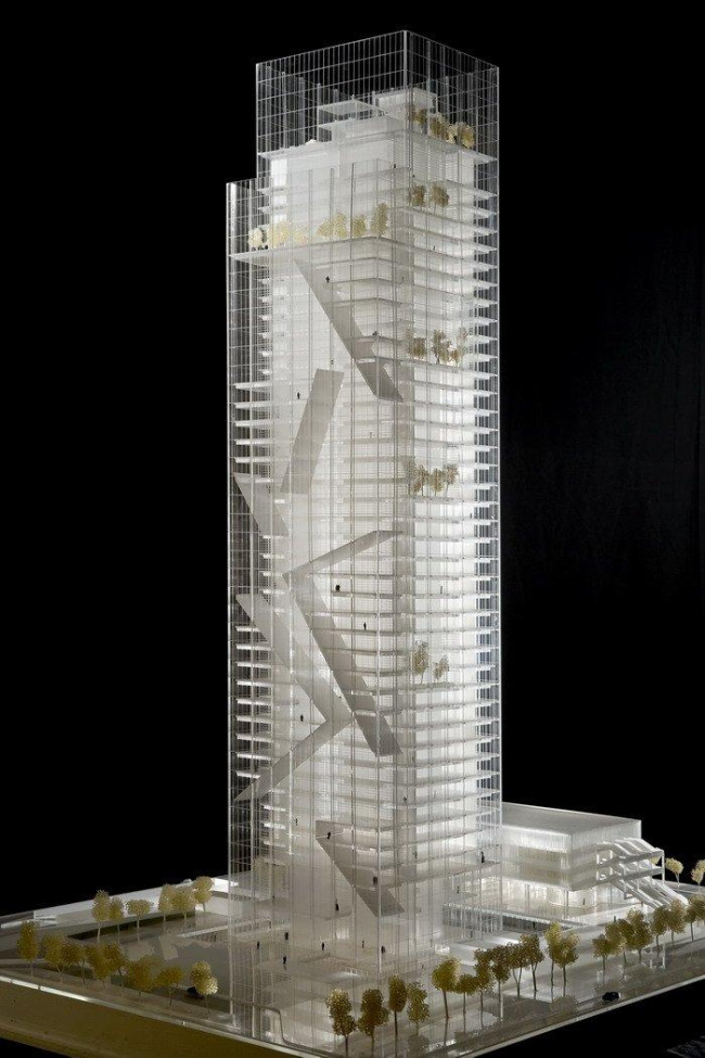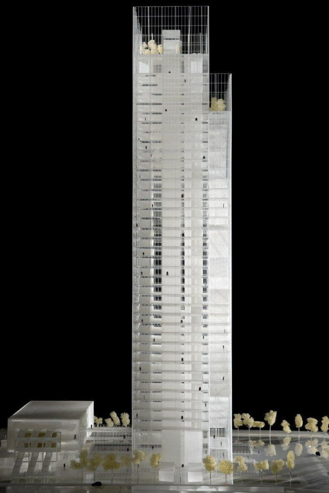 Главной особенностью постройки станет стеклянная навесная стена, отступающая со стороны главного фасада от объема башни: в образующейся при этом «пустоте» (выражение Фуксаса) будут устроены озелененные террасы для отдыха и общения сотрудников. Также там под разными углами будут помещены блестящие стальные «лезвия» — эти энергичные диагонали определят восприятие здания снаружи. Прозрачная оболочка - «вуаль» поднимется на 20 м выше самого здания: она защитит от ветра сад с водоемами, созданный на крыше небоскреба.