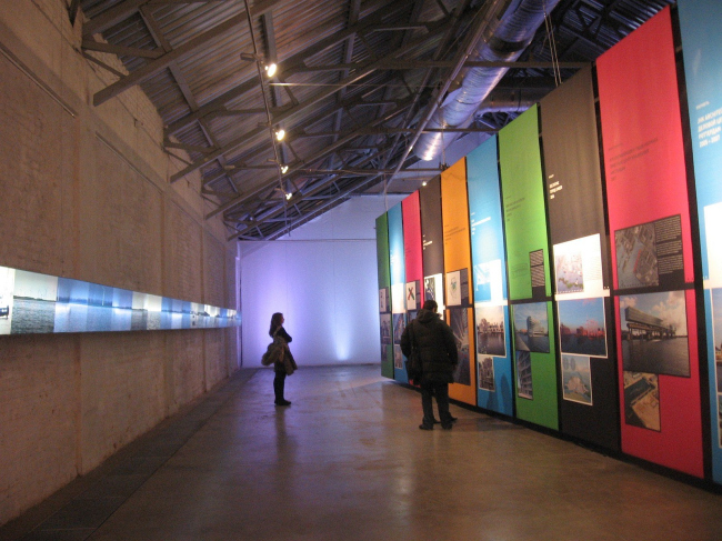Эти пять качеств символизируют пять ярких цветов, которыми и оформлены минималистские стенды с проектами, разместившиеся в Белом Цехе. Вертикальные планшеты формируют стены-оболочки центрального павильона, экспозицию которого составили пять кубов-экранов, демонстрирующих видеоинсталляции. Вмонтированы экраны и в импровизированные белые «пропилеи», оформляющие вход на выставку, на этих же конструкциях подробно расписаны сами пять «китов» голландской архитектуры. А по стенам цеха размещены узкие лайтбоксы с панорамами голландских пейзажей, будто увиденных сквозь модернистские ленточные окна. И фактически получается, что экспозиция – это своего рода метафора проекта, к работе над которым «подходят» через «пропилеи» пяти принципов, затем на их основе строят здание, и оно становится не самодостаточным объемным высказыванием, но оболочкой для важных социальных процессов.