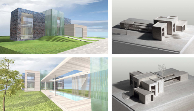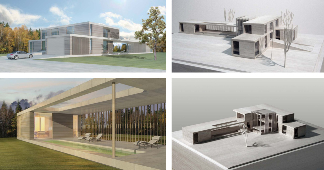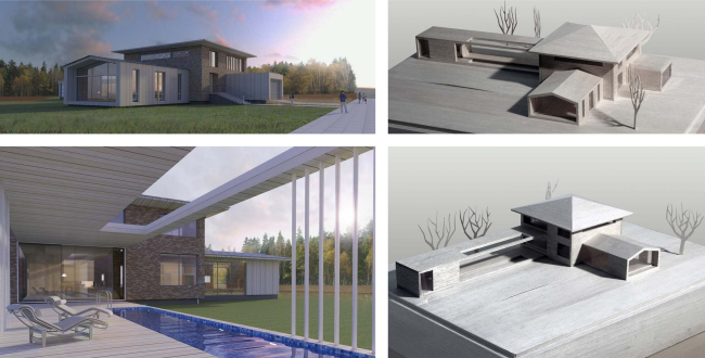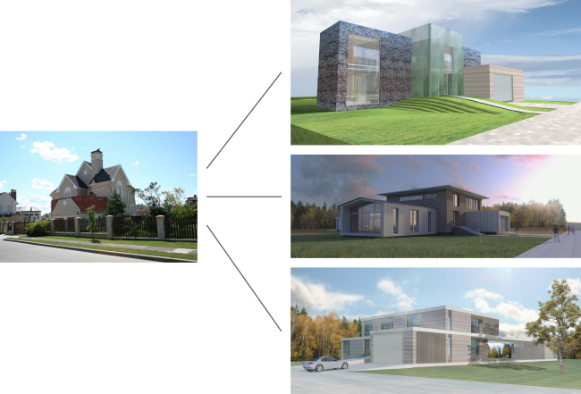 Архитекторы разработали три разных варианта реконструкции, каждый из которых по-своему развивает идею загородного дома. Важно, что в каждом из них за основу была взята конструктивная схема уже построенного здания – архитекторам было интересно исследовать ее с точки зрения формотворчества, а заказчику такой подход гарантировал существенную экономию средств.