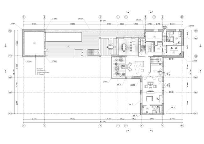 В пристройке разместились собственно баня и бассейн, которому объем и обязан своей вытянутой прямоугольной формой. С основным домом она объединена террасой, имеющей кровлю, но лишенной стен. Подобная «проницаемость» этого перехода делает всю конструкцию визуально легкой и почти прозрачной, уподобляя ее беседке, которой так не хватало на этом участке. На крыше террасы будет разбит небольшой садик, к которому обращено панорамное остекление спальни.