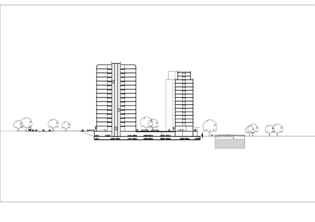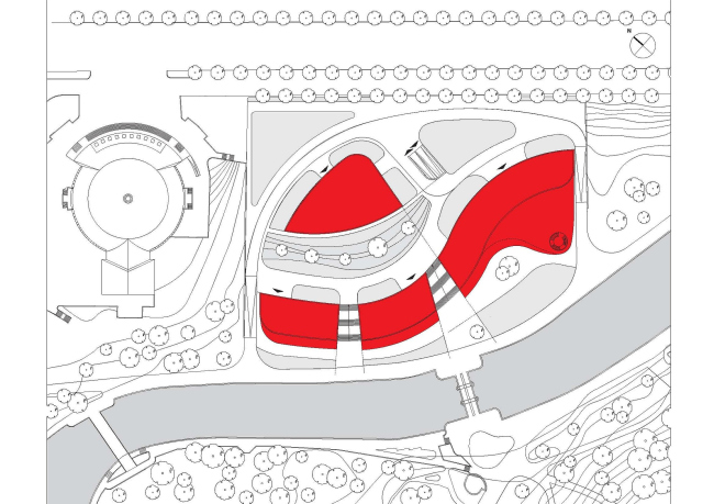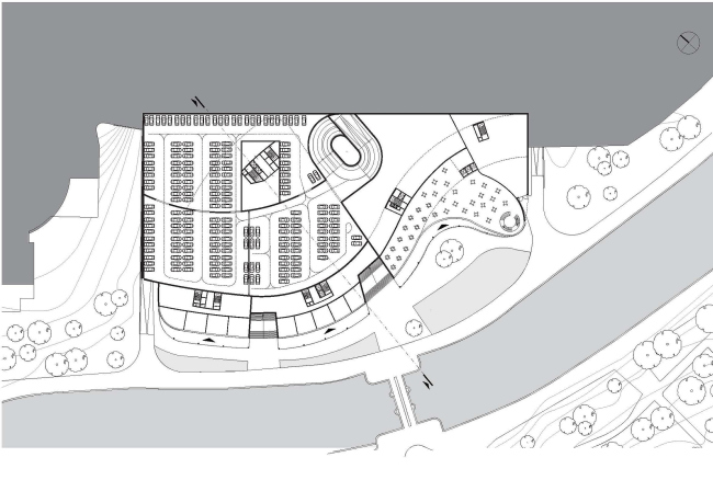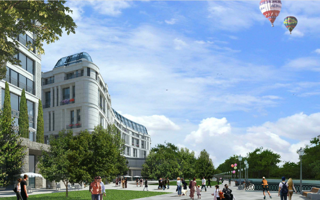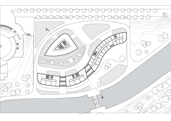 Комплекс состоит из четырех очередей – гостиница, два корпуса апартаментов и офисный блок поставлены на единый стилобат, в котором размещен паркинг. Первые три здания ориентированы на воду и размещены вдоль реки, причем апартаменты вторят изгибу русла, а гостиница, наоборот, плавно изгибаясь, отступает от берега, что позволило разместить перед ней обширную двухуровневую террасу. Можно подумать, что архитекторы сначала нарисовали один сильно вытянутый изгибающийся объем, а затем разрезали его на три неравные части и раздвинули их таким образом, чтобы между ними получились широкие парадные спуски к реке. Благоустройство набережной и организация здесь пешеходно-торговой зоны продиктованы не только градостроительной логикой развития участка, но и предписаниями минских властей, которые в данном случае именно так сформулировали «обременение» для инвестора. Бюро SPeeCH спроектировало набережную как логическое продолжение расположенного на другом берегу парка и переброшенного от него пешеходного моста. Своеобразным развитием темы парковой зоны можно считать и элементы вертикального озеленения, которое архитекторы применили в проектируемых зданиях.