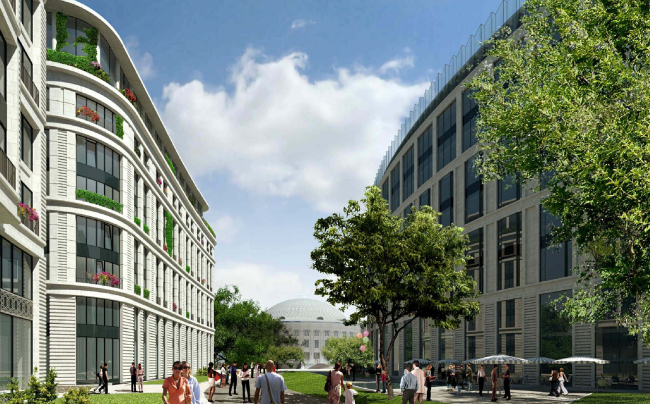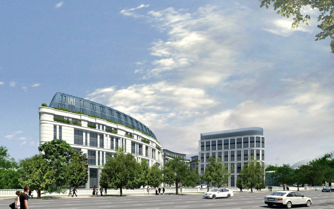 Оформляющие набережную объемы на первый взгляд очень похожи друг на друга, однако это впечатление обманчиво. Вроде бы все три здания действительно имеют одинаковую высоту и облицовку, а также два полностью остекленных верхних мансардных этажа, привносящих в строгий стройный вид озорную нотку хай-тека. Однако при внимательном рассмотрении понимаешь, что в деталях они совершенно разные: ритм и рисунок окон, пластика фасада, количество вертикальных цветников. Эта тонкая вариативность не бросается в глаза, но делает комплекс разнообразным, в то же время не противореча целостности решения.