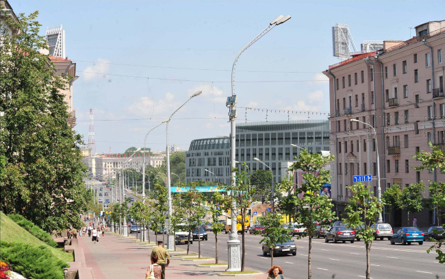Проспект Независимости – одна из главных магистралей Минска, имеющая протяженность около 15 км и пересекающая город от центра на северо-восток. Он был спроектирован в 1952 году, когда Минск заново отстраивался после Великой Отечественной войны, и имя сначала получил соответствующее – проспект Сталина. Это название красноречиво свидетельствует не только о тогдашнем политическом строе, но и о характере застройки: существовавшая здесь прежде улица была спрямлена и расширена, а оформили ее массивные представительные дома, облицованные натуральным камнем. Застройка магистрали продолжалось вплоть до конца 1970-х годов, причем улицу переименовали в Ленинский проспект, а сталинский ампир, по мере удаления от центра города, вполне закономерно уступил место модернизму. Для архитекторов, работающих над обликом нового объекта, это стало важным стилистическим ориентиром.