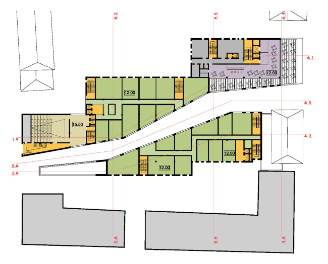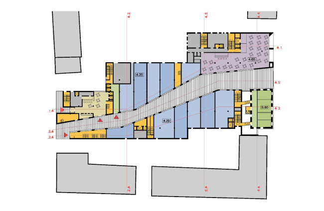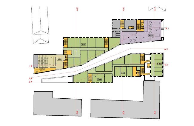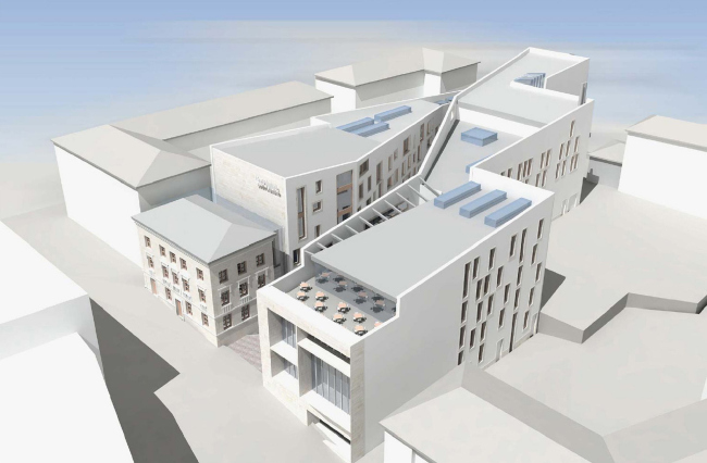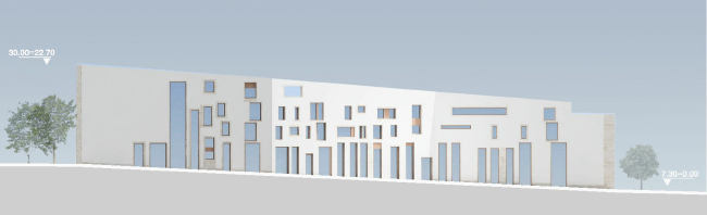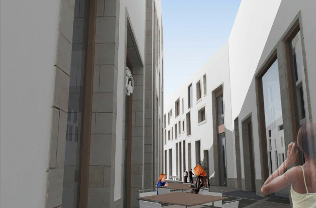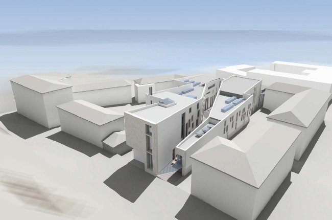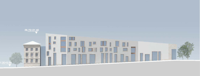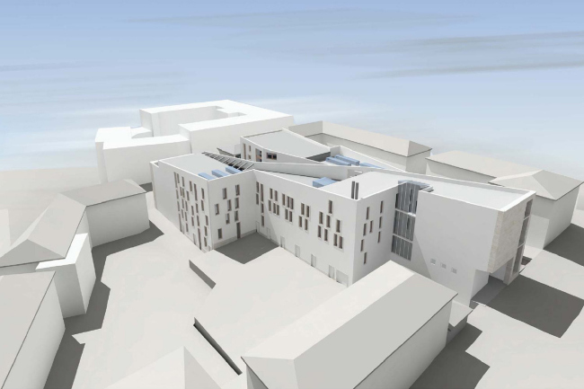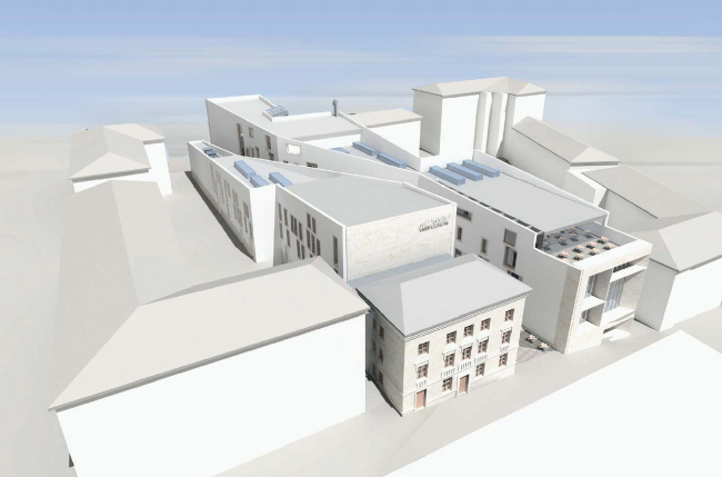 Швейная фабрика расположена рядом с морем, на берегу Артиллерийской бухты Севастополя, в зеленом «сталинском» районе на набережной, которая с недавнего времени носит имя генерала Корнилова. С одной стороны – пышные колонны и массивные карнизы послевоенной классики, с другой – брутальные фигуры героев Великой отечественной. Главное здание фабрики – это длинный прямоугольный корпус, объем которого разрезает пополам трапециевидный квартал, обстроенный по периметру жилыми домами. Этот очень длинный дом, фактически служит перемычкой между улицами Айвазовского, ведущей к Артиллерийской бухте, и Маяковского, уводящей, напротив, прочь от моря, к центру города. На месте этого корпуса архитекторы предложили соорудить новое здание, прорезав его по диагонали новой пешеходной улицей в сторону моря. Коммерческая состоятельность подобного решения очевидна: на пешеходную зону можно раскрыть куда больше общественных заведений и магазинов, чем на имеющиеся улицы, к которым комплекс изначально обращен узкими торцами. А еще участок расположен на склоне и перепад высот на его территории составляет почти 7 метров. Идея извилистой мощеной улочки, спускающейся к морю, показалась архитекторам настолько близкой духу Севастополя, что никакие другие аргументы в пользу этого решения уже не требовались. Пешеходная зона спроектирована криволинейной не только из желания создать уютное пространство южного приморского города и замкнуть перспективы изгибами узких улиц. Прежде всего, архитекторы заботились о комфорте тех, кто будет по ней гулять: будь улица ровной, она превратилась бы в довольно крутую горку, поход по которой далеко не каждый смог бы назвать приятным. Живописно переламываясь, пешеходная улочка делит комплекс на два корпуса, которые на уровне земли кажутся совершенно самостоятельными строениями, хотя на самом деле объединены общим подземным пространством с паркингом. Изломы их фасадов представляют собой зеркальное отражение друг друга, из-за чего комплекс становится похож на гору, рассеченную надвое ударом молнии. Это ощущение усиливает подчеркнуто зигзагообразный рисунок улицы: здания, разделенные ею, в плане напоминают сложенные вместе латинские буквы p и b. А вот высота у корпусов разная: один отчетливо спускается по склону и «раскладывается» на несколько гигантских ступеней, а второй, наоборот, растет в противоположную от моря сторону. В противном случае в довольно узкую расщелину пешеходной улицы и окна выходящих в нее офисов не попадало бы достаточно солнца. Близость моря и обаяние курортного города оказали самое непосредственное влияние и на внешний облик комплекса. При этом архитекторы не стали ни воспроизводить черты столь свойственного Севастополю классицизма, ни фантазировать на морскую тематику. Дань уважения яркому южному солнцу и сложившейся застройке «августейшего города» авторы отдают с помощью тщательно продуманного подбора материалов. Все фасады комплекса будут отделаны исключительно в светлых тонах и тем самым поддержат праздничную палитру севастопольской застройки. Для обрамления оконных проемов, углов домов, а также фасадов, выходящих на улицы Айвазовского и Маяковского, архитекторы намерены использовать светлый известняк, основные же плоскости стен будут покрыты крупнофактурной штукатур