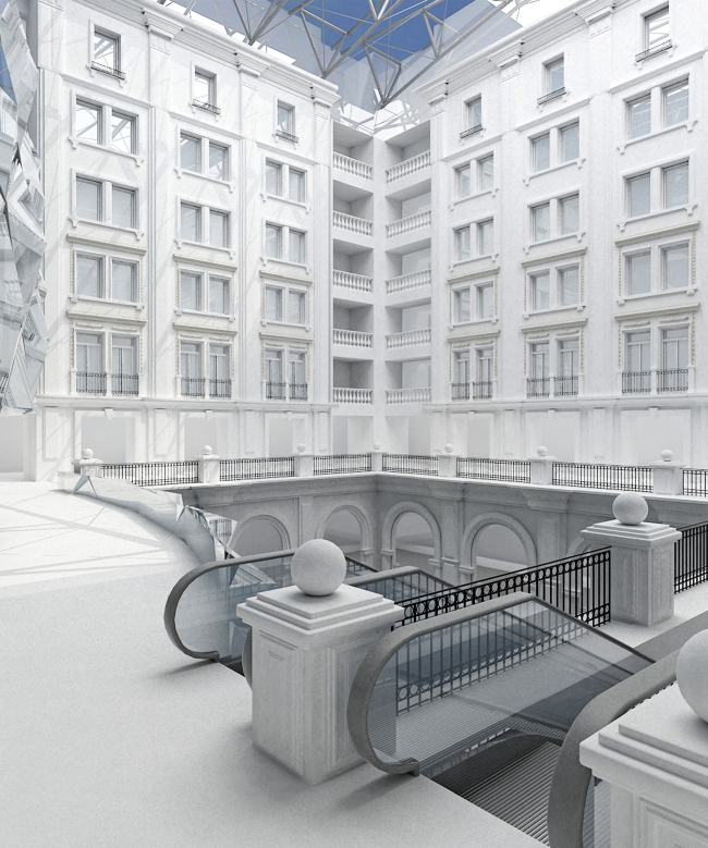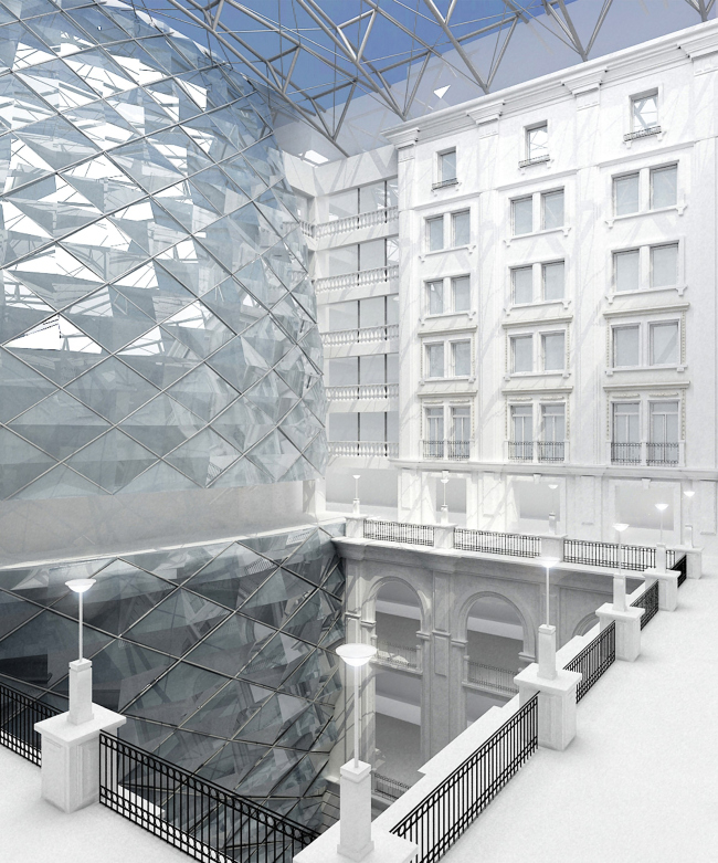Как и следовало ожидать, основные изменения ждут не фасады и интерьеры исторического здания (они сохраняются и реставрируются), а внутренняя планировка строений, расположенных на участке. Фактически, кроме интерьеров знаменитой булочной и кофейни, а также «готического» фойе на втором этаже, все остальные помещения будут отстроены заново. Вживление же новых «органов» вроде фитнес- и спа-клуба с бассейном, а также конгресс-центра будет осуществлено за счет освоения внутреннего двора и разборки ветхих строений, входивших в состав данного владения. Все это пространство, фактически, останется, но из дворового превратится во внутренний атриум цилиндрической формы, вокруг которого и будут сгруппированы все функциональные помещения наземной части. Сегодня существует два рабочих варианта решения его внутренних фасадов – в традиционной манере (стена – окно) и в современном оформлении, контрастирующим с наружным решением и очевидно тяготеющем к хай-теку.