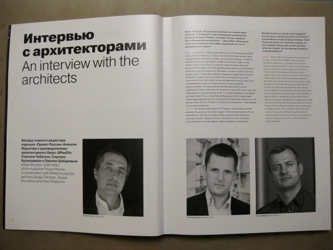 О том, что Чобан, Кузнецов и Шабуров действительно прекрасно владеют данным навыком, лучше всего свидетельствует опубликованное в монографии интервью Алексея Муратова с этими тремя архитекторами. В беседе, занимающей двадцать страниц, партнеры рассказывают о своем сотрудничестве, организации творческого процесса и бизнеса, влиянии на их работу экономического кризиса и, конечно, своих взглядах на архитектуру. Основатели SPeeCH – сторонники градостроительного подхода к объемному проектированию и уверены в том, что, только основываясь на принципах архитектурно-композиционного единства, можно создавать по-настоящему жизнеспособные и долговечные здания. Правда, в то, что реализовать подобный принцип можно в масштабах такого города, как Москва, архитекторы верят мало: «Это мегаполис, в котором сложно сохранить или воссоздать среду европейского города, поскольку он переплетен магистралями, железными дорогами, коммунальными зонами. Но в камерном масштабе это сделать можно», – уверен Павел Шабуров. В том, что это не просто слова, убеждает раздел «Градостроительные концепции», где опубликованы проекты для самых разных районов Москвы, от Сретенки до Отрадного и Рублево-Архангельского, наглядно демонстрирующие созидательный градостроительный подход SPeeCH.
