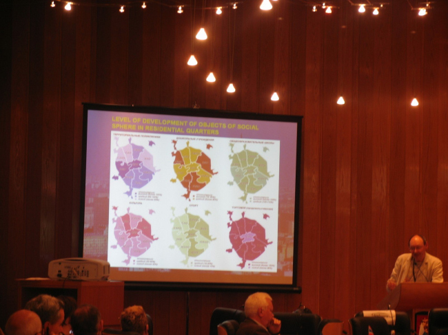 По словам заведующего научно-проектным отделением перспективного градостроительного развития Москвы НИиПИ О.А. Баевского, одна из слабых сторон города – неразвитость социальной сферы. Социального жилья, которому сейчас уделяют много внимания на Западе (20-60% от всего строительства), в Москве не хватает. При этом темпы коммерческого строительства растут со скоростью 20% в год, что только обостряет проблему. Как справедливо заметил докладчик, строительство в Москве стало вложением денег, а не улучшением жизни. Вывод О.А. Баевского – необходимо создать фонд социального найма, который бы отвечал за социальную эффективность жилья.