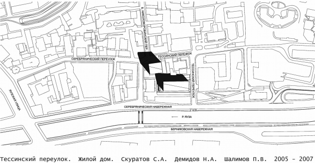 Участок, на котором будут построены два элитных дома, находится на набережной Яузы напротив «горбатого мостика», в районе Площади Ильича. Если не считать отдаленного соседства Рублевского музея – Спасо-Андроникова монастыря, в остальном эти места когда-то были вотчиной ранних промышленных зданий, прямоугольные кирпичные корпуса которых Скуратов считает самой интересной частью ближайшего окружения места строительства. Теперь из старых заводских зданий рядом имеется лишь один кирпичный корпус.