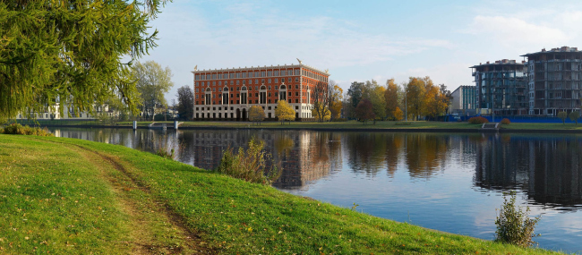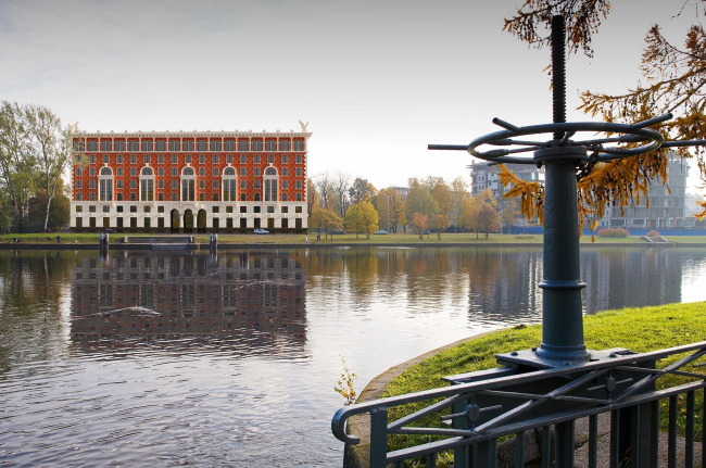 Крестовский остров, постепенно застраиваясь, превращается в заповедник элитного жилья Петербурга, и Евгений Герасимов работает здесь не впервые. Достаточно сказать, недавно здесь был закончен «Дом у моря», построенный Герасимовым в соавторстве с Сергеем Чобаном, сразу же получивший несколько профессиональных наград. Здесь же несколькими годами ранее Евгений Герасимов построил гостиничный комплекс «Пятый элемент» и спроектировал еще несколько жилых домов, в том числе и на Депутатской улице. Депутатская – одна из самых живописных и тихих улиц Крестовского острова. Она проходит по той его оконечности, что обращена к Елагину острову и лишь по милости реки Крестовки отрезана от Каменного. Улица вторит плавным очертаниям берега и до сих пор остается тихой, почти идиллической: вблизи расположен только один коттеджный поселок (он принадлежит Конституционному суду), и строятся два малоэтажных жилых комплекса. Так что место парковое, почти пустынное, да еще и у воды. Что же касается адреса «Депутатская, 34», то до самого недавнего времени здесь располагалась гостиница «Спортивная», построенная к Олимпиаде-80 и позднее переродившаяся в отель «Крестовский остров». Это было по-своему примечательное здание, украшением главного фасада которого служил вставленный в него реконструированный пятиэтажный дом в стиле модерн. Обильно декорированный цветным гранитом и облицовочным кирпичом различных оттенков, фигурными сандриками и плиткой, он был заключен в брутальную оправу двух высоких лестничных объемов из блеклого советского кирпича, и являл собой интересный пример того, насколько способны (или не способны, ибо мнения всегда расходились) сосуществовать и вживаться друг в другу архитектуры различных эпох. Городским властям, впрочем, подобные эссе в материале общей площадью около 10 тысяч квадратных метров не показались интересными, и здание приговорили к сносу. Главным ориентиром в работе над будущим жилым комплексом для Евгения Герасимова стала река. Здание, которое будет видно с воды как на ладони, в Петербурге по определению не может быть ни скромным, ни блеклым. Так что, поддавшись очарованию места, Евгений Герасимов спроектировал дом-дворец или, что даже точнее, дом-замок. Впрочем, рассматривая получившуюся архитектуру, можно обнаружить в ней сразу много различных аллюзий. Прежде всего это, конечно, Венеция. Где еще можно встретить кирпичное палаццо с белокаменными деталями, гордо стоящее у воды? Теперь уже, конечно, во многих городах есть подобные вещи, но венецианские дворцы – определенно первоисточник образа. Навеянного, что достаточно очевидно, известным словосочетанием «Северная Венеция»… Но в Венеции, да и в других городах, подобные дворцы стоят как правило в ряду себе подобных, а не посреди природы. Поэтому дом выглядит как зародыш каменного города, утвердившийся на берегу в ожидании будущих соседей. Но пока дом один, среди берез он выглядит, прямо скажем, неожиданно – уж очень строг его прямоугольный объем, очень уж закрыт и замкнут. Отсюда еще один прообраз – замок. Точнее – можно здесь увидеть намек на дворцы Павла I, Михайловский замок и Гатчину. Именно Павел начал превращать дворцы Петербурга, до этого фривольно-пышные или уточненно-классицистические, в романтические замки. Он построил Михайловский замок, и имен