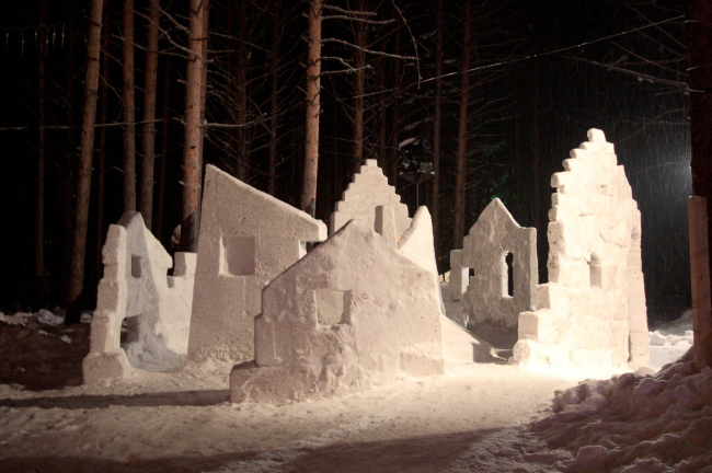 «Белый город» был построен за неделю, с 20 по 27 февраля. Площадкой фестиваля на этот раз стал Великий Устюг, а если точнее, то крупнейший в этом городе туристическо-развлекательный комплекс «резиденция Деда Мороза». Основная территория вотчины – это сосновый лес с крохотными полянами между деревьев, одни из которых уже застроены арт-объектами, а другие еще пустуют. Работы участников фестиваля расположились вдоль единого пешеходного маршрута – так называемой Тропы Сказок, – и сегодня уже стали полноправными объектами показа.